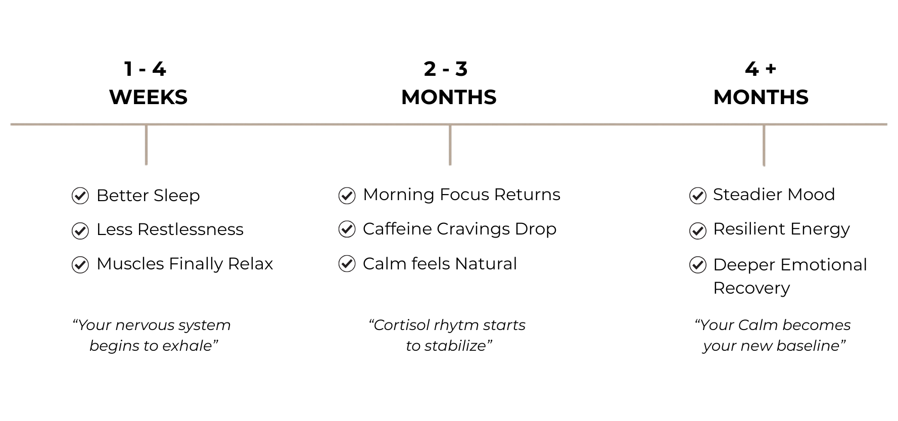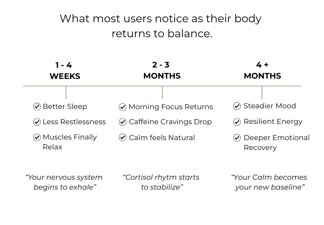 Full nervous system benefits, like steady energy and reduced tension, typically become consistent around the 3–4 week mark.