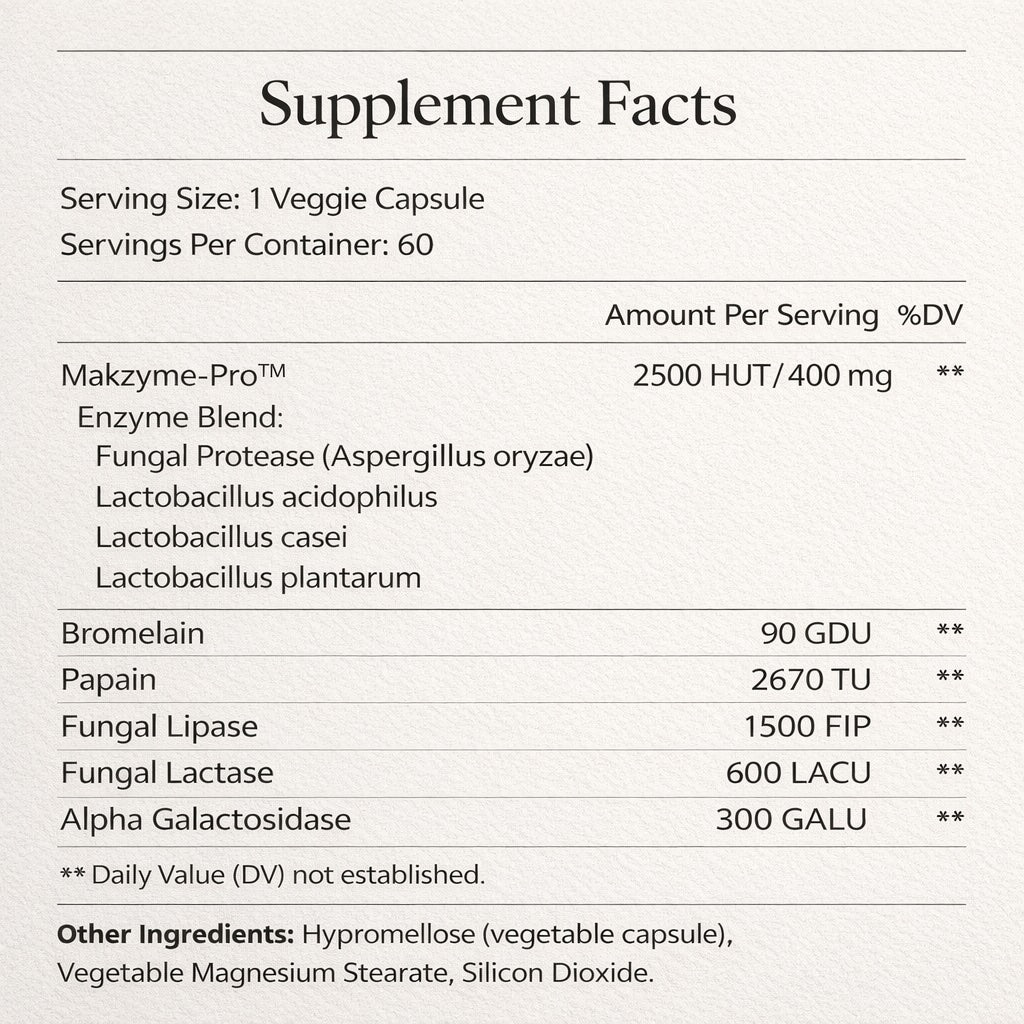 Powered by Makzyme-Pro™ — derived from Aspergillus oryzae, the enzyme source discovered in 1894 and originally sold by Pfizer.